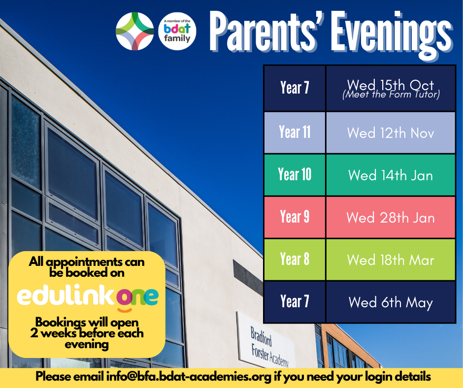 These evenings will be bookable on EduLink 2 weeks before the date of the event