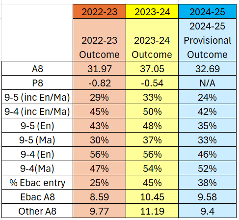 We are not able to calculate Progress 8 scores for academic years 2024/25 and 2025/26. This is because there is no KS2 assessment data available to calculate the baseline for Progress 8 for these years due to Covid-19 disruption.